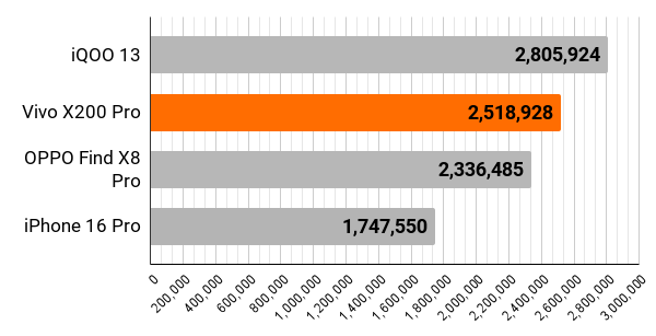 AnTuTu tests a smartphone’s overall speed with respect to processor. Higher scores mean faster, smoother device performance.To put it briefly, the Vivo X200 Pro is an outstanding performer, offering blazing-fast speeds in real-world usage, even if it doesn’t lead the pack in synthetic benchmarks. Powered by the Dimensity 9400 SoC, it handles demanding tasks with ease and is optimised to minimise throttling compared to its competitors in the segment.